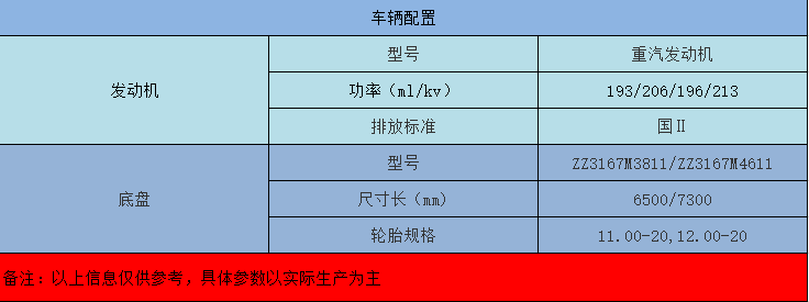 該車為中國重汽成熟產(chǎn)品,動力性優(yōu)越,油耗低,性能穩(wěn)定可靠,并具有多種個(gè)性化配置可選擇。適用于礦洞及復(fù)雜工地中短途運(yùn)輸。